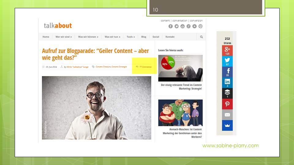 Auf das passende Thema kommt es an bei einer Blogparade, denn mit dem Thema verbinden dich die Menschen. Für Mirko Lange passte der Aufruf zur Blogparade mit dem Aufruf „Geiler Content – aber wie geht das?“ perfekt, denn bei diesem Thema hat er die Nase vorn. Insgesamt siebenundsiebzig Blogartikel wurden daraufhin verfasst und jeder Artikelschreiber hat selbstverständlich den veröffentlichten Artikel in Social Media geteilt. So ergeben sich 232 Shares und viele Likes.